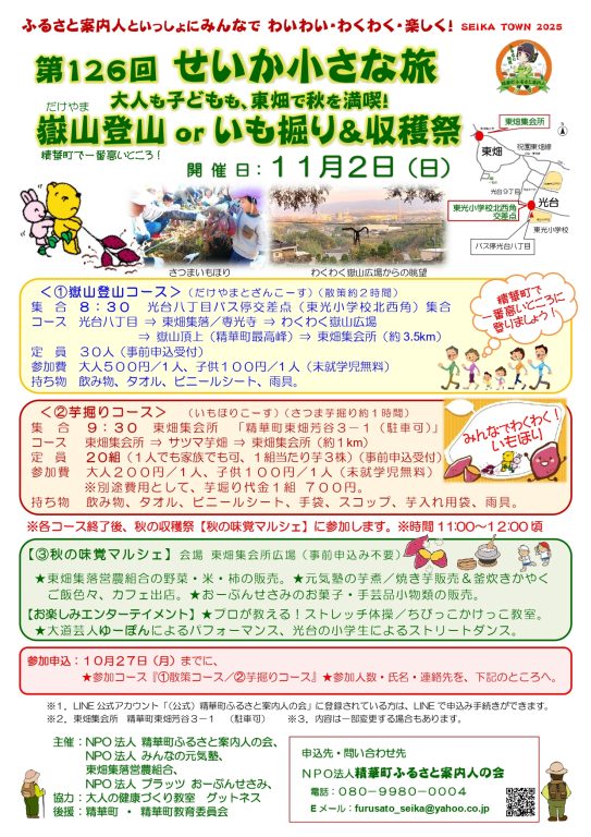 - 要申込(★参加コース『①散策コース/②芋掘りコース』★参加人数・氏名・連絡先を下記問い合わせ先のところへ)