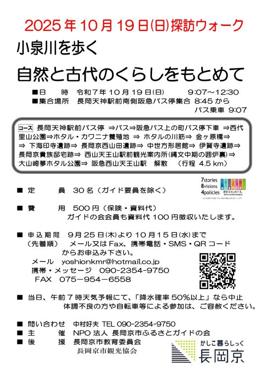 長岡天神駅前バス停 ⇒バス⇒阪急バス上の町バス停下車 ⇒西代里山公園⇒ホタル・カワニナ養殖地 ⇒ ホタルの川筋⇒ 金ヶ原橋⇒ 下海印寺遺跡⇒ 長岡京西山田遺跡⇒ 中世方形居館⇒ 伊賀寺遺跡⇒長岡京貴族邸宅跡⇒ 西山天王山駅前観光案内所(縄文中期の囲炉裏)⇒大山崎夢ホタル公園⇒ 阪急西山天王山駅 解散 (行程 4.5 km)