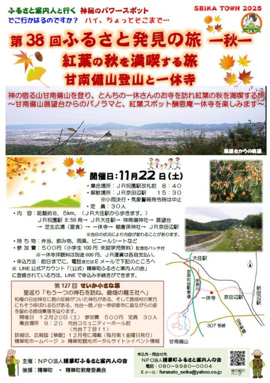 - 要申込(前日迄に、電話又はEメールで問い合わせ先にご連絡願います。※ LINE公式アカウント「(公式)精華町ふるさと案内人の会」に登録されている方は、LINEで申込み手続きができます。)