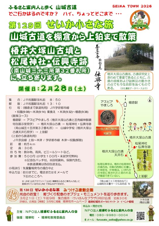 棚倉駅 → アスピアやましろ(椿井大塚山古墳と三角縁神獣鏡特別展示室見学)→ 椿井大塚山古墳 → 松尾神社・伝興寺跡(南山城三十三所第32番札所)→ 山城中学校(椿井大塚山古墳天井石見学)→ 上狛駅